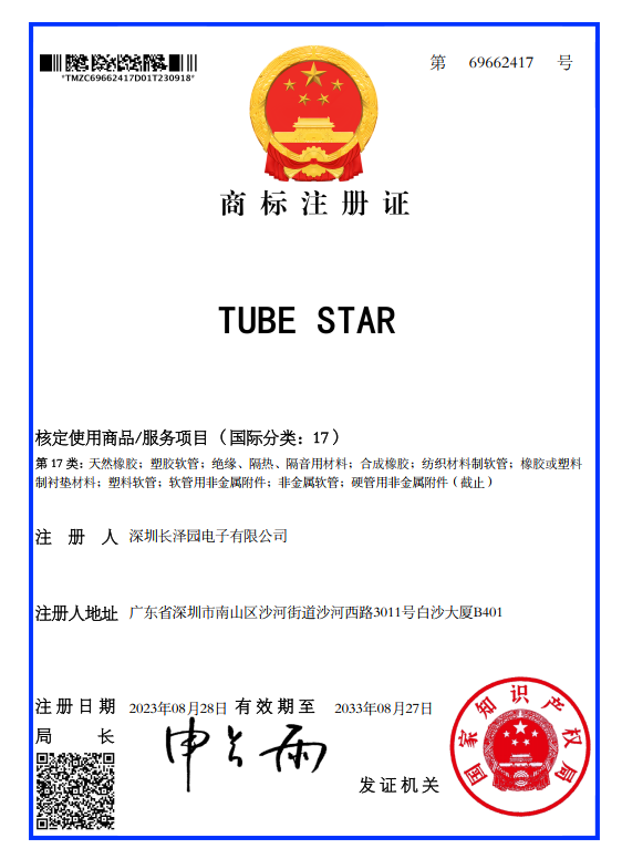 2023年9月公司取得商标注册证(TUBE STAR)